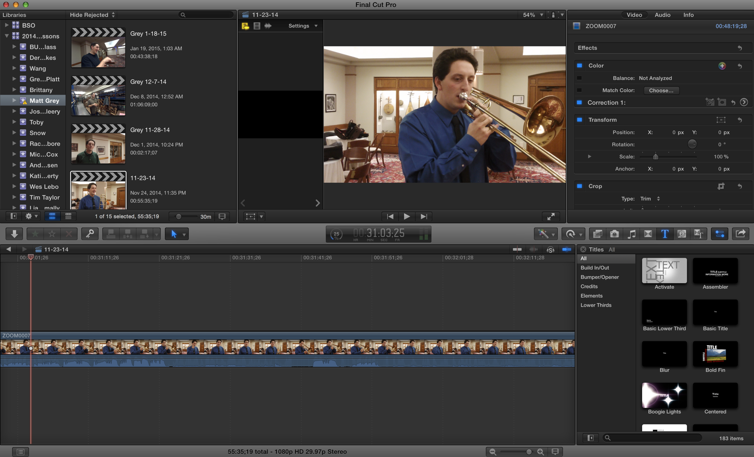 In Final Cut Pro X, I can quickly import media from the mini SD card, normalize the audio of a lesson so that the sound portion of the recording is within an acceptable range, and export the file to a shared Google Drive folder. The original file recorded at 720p is about 5GB and using Final Cut, I am able to shrink a 1 hour lesson down to a little less than 500MB if necessary or a bit bigger for a more important event. I have had positive experience with Adobe Media Encoder and iMovie as well and although they get the job done, Final Cut Pro X seems to be the most user friendly.